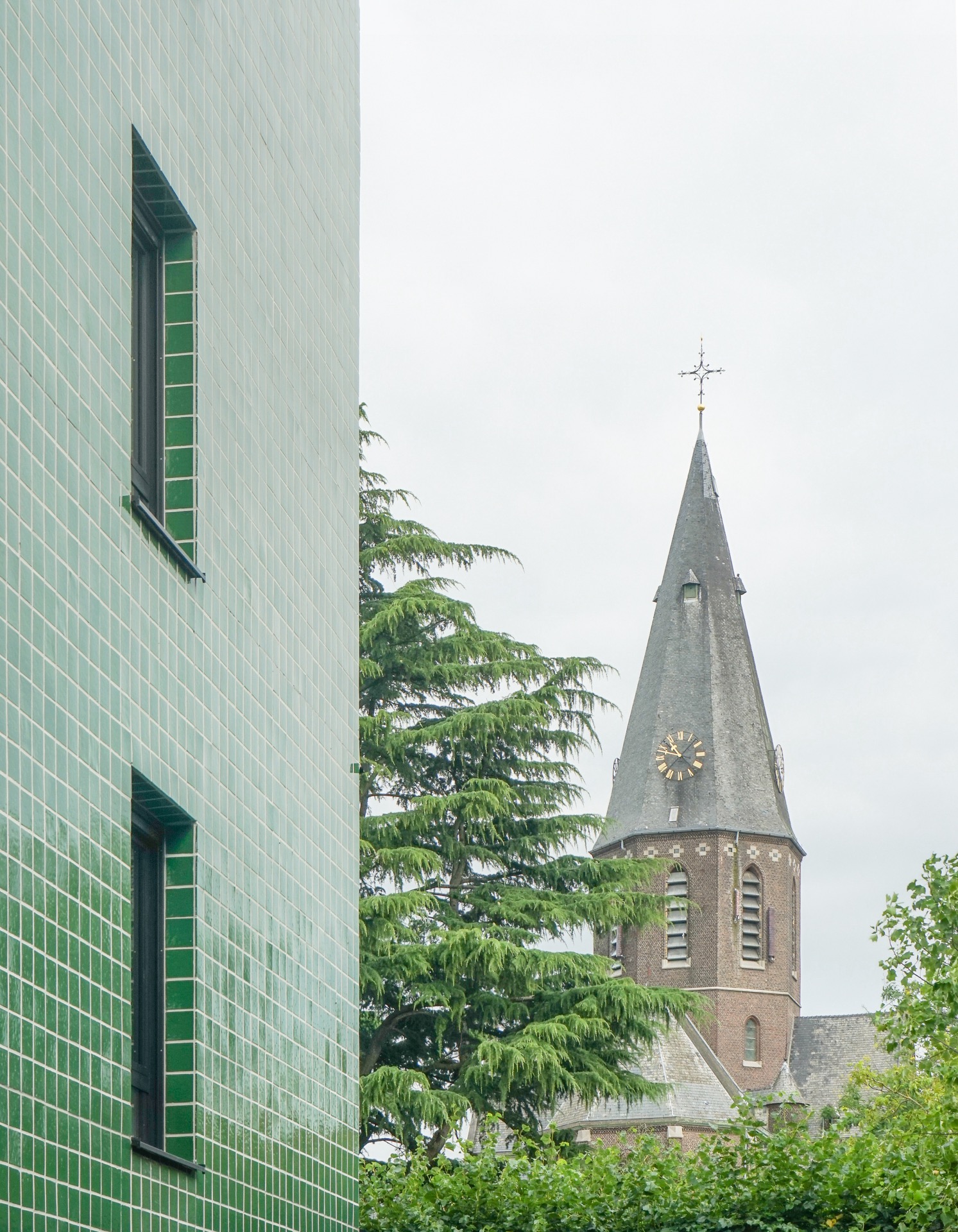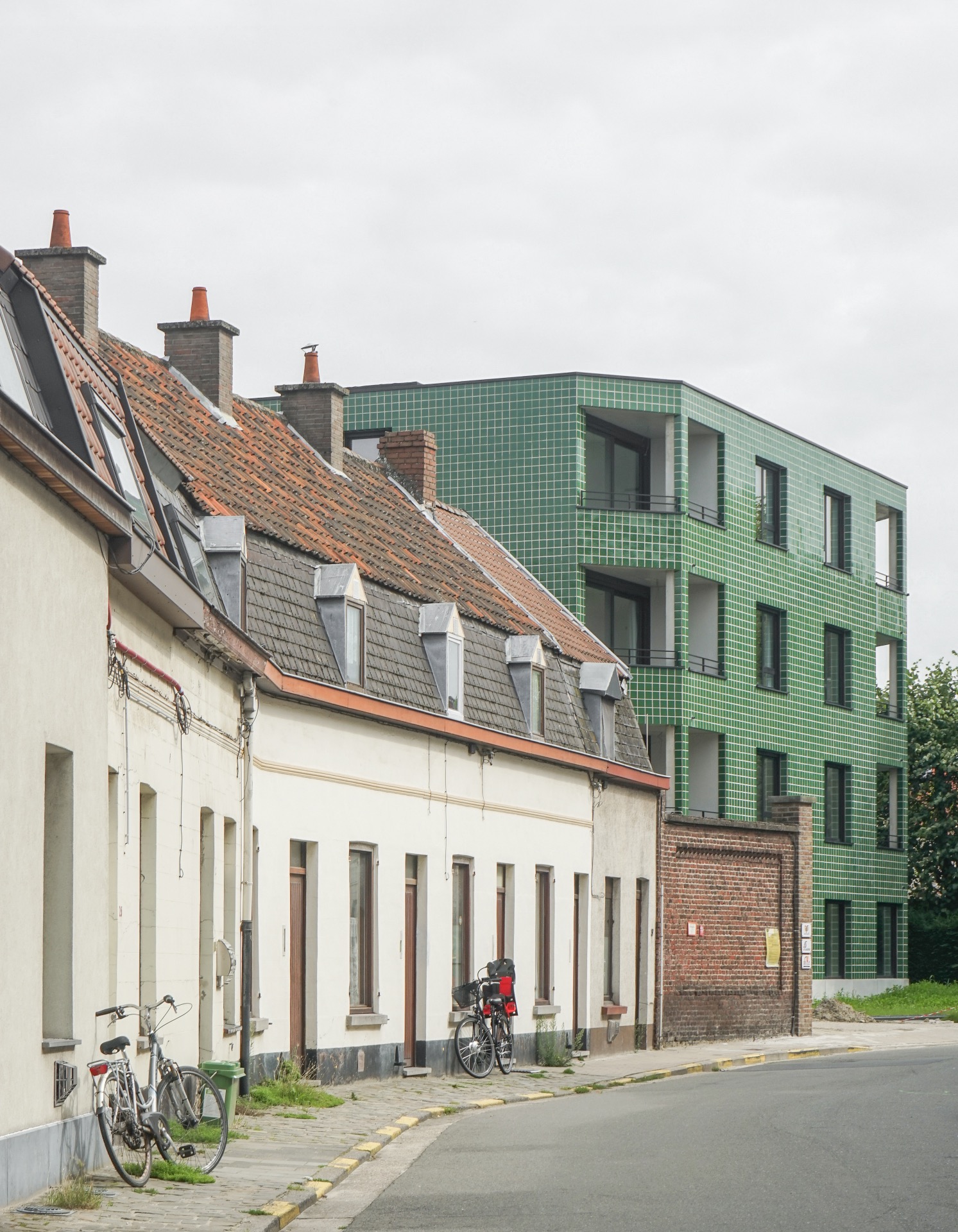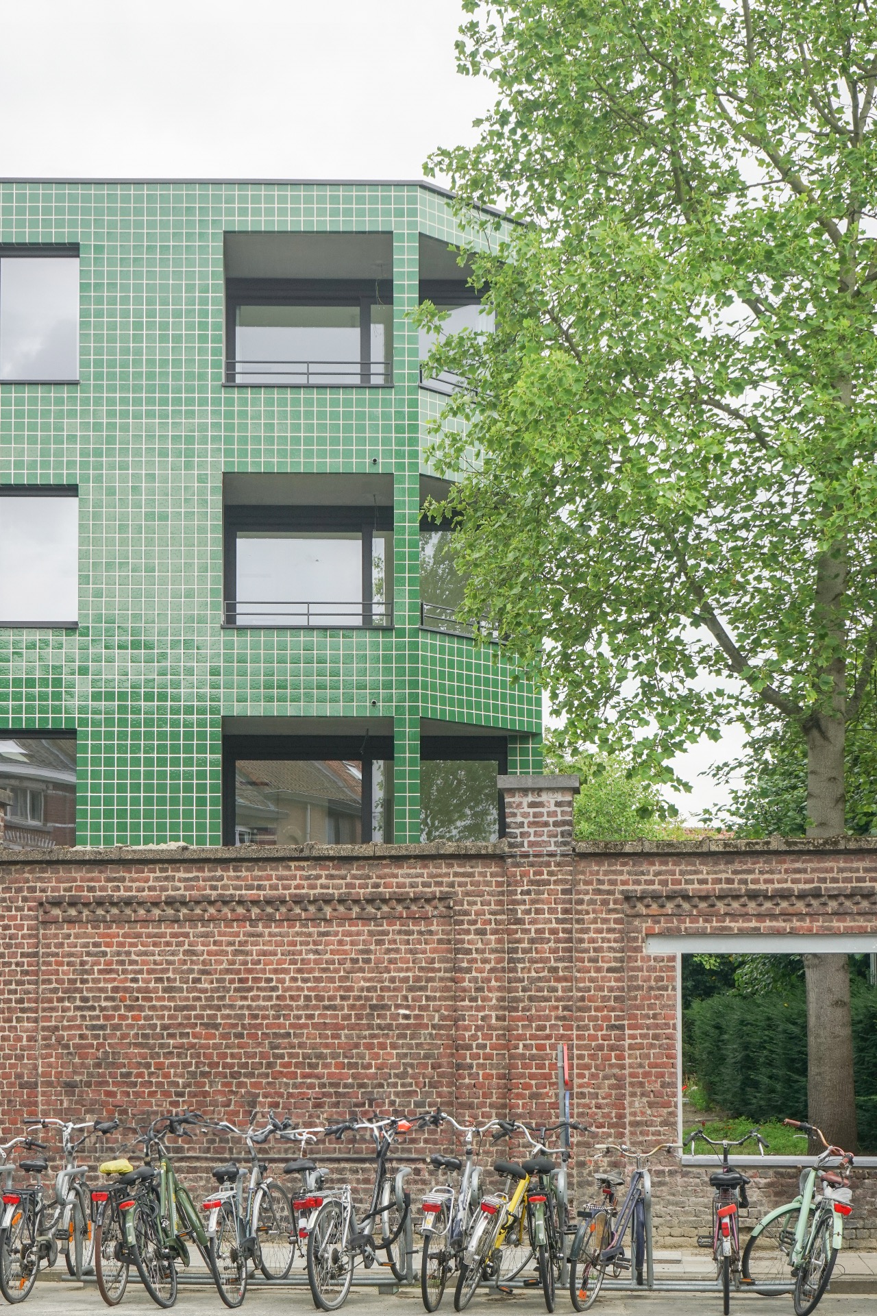 Dit project voegt waarde toe aan de omgeving en het achterliggende woonzorgcentrum. De kapel, voortuin en tuinmuur verwijzen naar de geschiedenis van de site en worden maximaal gerespecteerd. De tuinmuur zorgt voor een geleidelijke overgang tussen privaat en publiek. Twee van de vijf nissen zijn opengewerkt met een zitbank, wat uitnodigt tot gebruik zonder de privacy van bewoners te schaden. De nabijheid van het woonzorgcentrum maakt efficiënt ruimtegebruik mogelijk zonder in te boeten op faciliteiten. Het ontwerp combineert compactheid en ruimtelijkheid met een huiselijk gevoel. De grotere afstand tot de perceelgrenzen en de symmetrie in de gevels benadrukken het solitaire karakter van het gebouw. De geglazuurde diepgroene tegel verandert van reflectie afhankelijk van de lichtinval.
