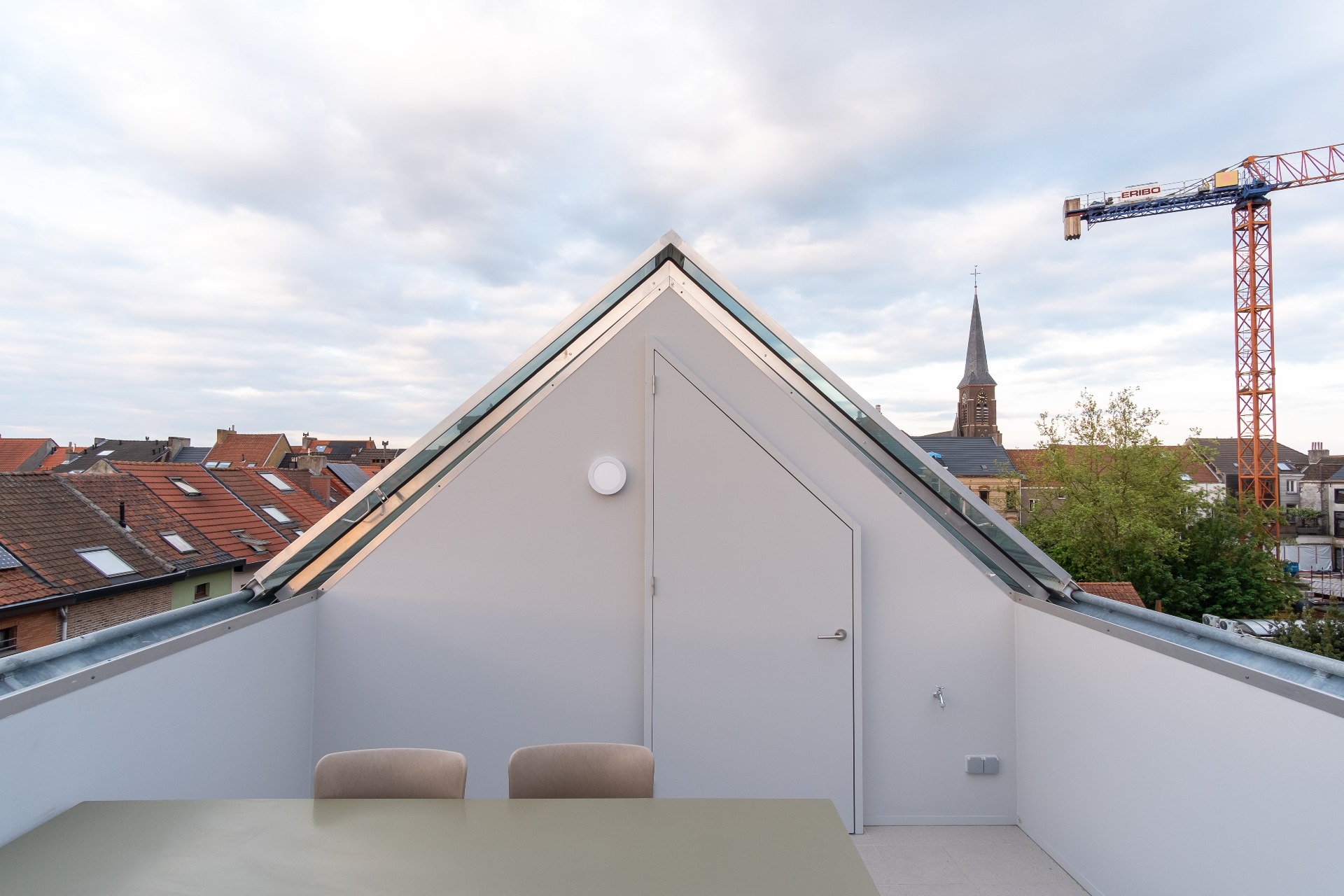 Nood aan zon en ruimtegevoel worden klassiek ingevuld met een tuin, maar in dit ontwerp zit de ruimtelijkheid intern. Met een plafond van vier meter hoog in de leefruimte en zicht op de variaties van wolken en zon, kleur en licht in de lucht, wordt het onderhoud van een mooie terrastuin een optie, geen prioriteit. De woning heeft twee volwaardige en contrasterende buitenkamers en een kleine patio. Naast het kleine tuintje is er een ruim ommuurd drempelloos terras aan de keuken. Op het dak is een wintertuin, waar ook een kwetsbare bewoner in het tussenseizoen beschut kan genieten van de omliggende skyline van de stad. In de zomer schuift het dak open en is er een extra terras. Het beeld van een bejaarde die de krant leest in een stoffige zetel in een veranda, is naar een luxeversie herdacht met een eenvoudige kunstgreep.