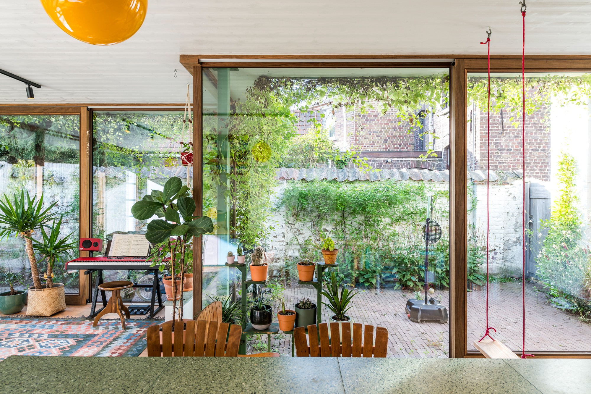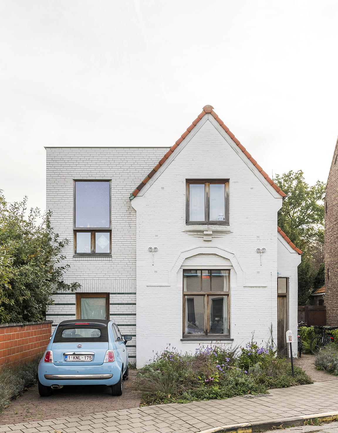 Een klein, gemetst huisje midden in Sint-Denijs-Westrem, een dorp dat inmiddels is opgeslokt door de grote stad, is bijna honderd jaar oud. Tijdens een eerste verbouwing werd het huisje in orde gezet en ontdaan van de wildgroei aan koterijen. In de diepe tuin maakten saaie sparrenhagen en betonnen verhardingen plaats voor een wilde, natuurlijke tuin met bloemenweide en speelbos. Het gezin groeide en een tweede verbouwing diende zich aan. De nieuwe leefruimte bestaat uit een grote luifel met rondom glazen schuifdeuren. Deze ‘tuinkamer’ haalt de tuin tot binnen in het huis, met veel plaats voor planten, spelen, knutselen, enzovoort. Een nieuwe uitbreiding voor een extra slaapkamer en badkamer sluit qua vormgeving en volume aan bij het historische karakter van het huisje en het omliggende beschermde dorpszicht. Het houten buitenschrijnwerk en de groene geglazuurde steenlagen zijn een knipoog naar de typische gevels van de oude dorpswoningen.