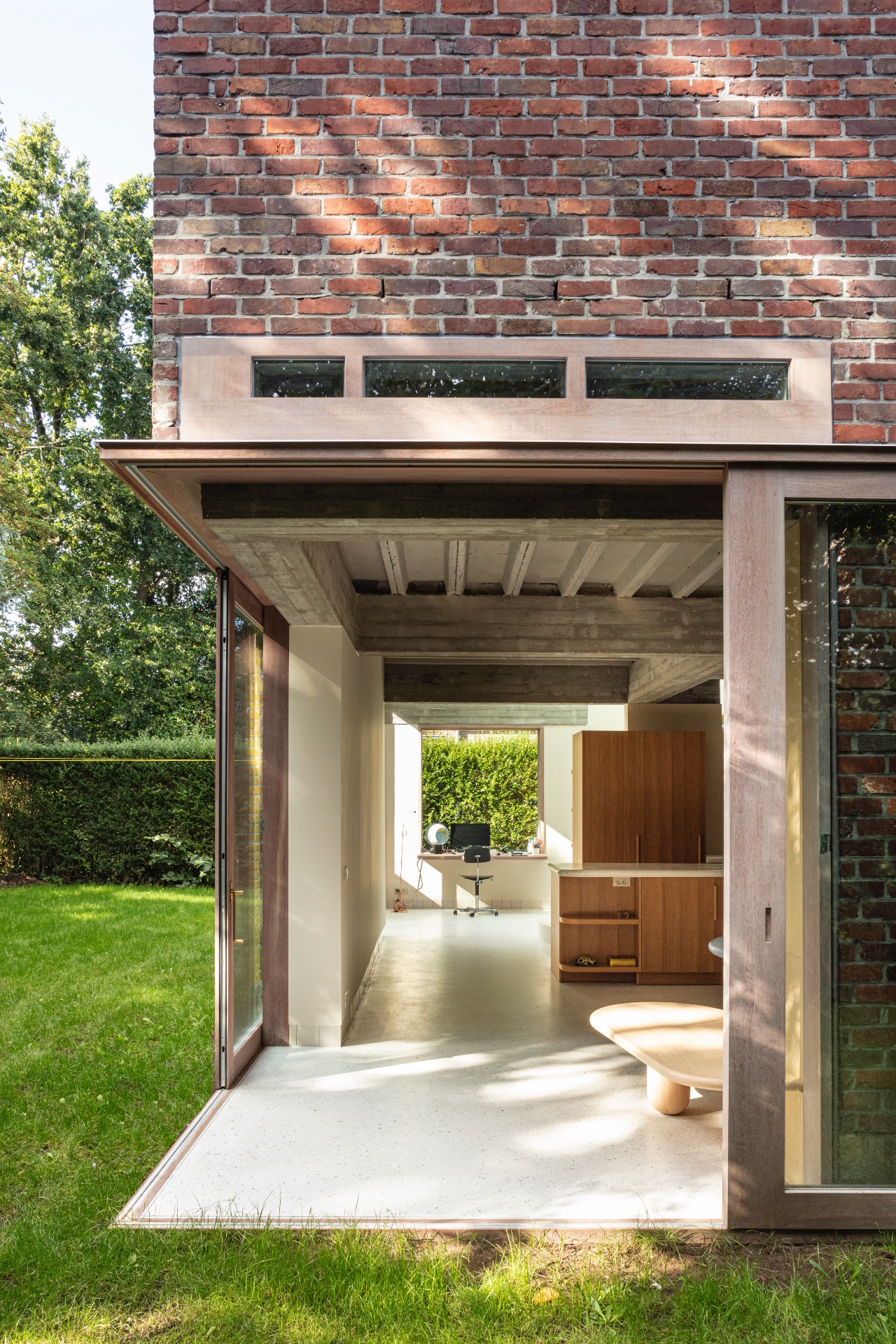 Een vrijstaande woning uit de jaren zestig in de 20e-eeuwse gordel rond Gent werd in de jaren negentig opgedeeld in twee appartementen. De opdracht was om hier weer één volwaardige woning van te maken voor een gezin met drie kinderen. Wat te doen met het patrimonium uit de periode 1960-1990? Deze woning, gelegen in een oude verkaveling, is goed bereikbaar met het openbaar vervoer en ligt op wandelafstand van de stad. Het gebouw was te goed om af te breken, maar te slecht om te conserveren. Daarom is besloten om de bestaande kwaliteiten te behouden en een nieuwe dynamiek te creëren door zorgvuldig in te grijpen. Het gebouw fungeert als een palimpsest, waarbij een duidelijke en precieze laag is toegevoegd die, met respect voor het bestaande, het gebouw op een duurzame manier omvormt tot een hedendaagse woning.