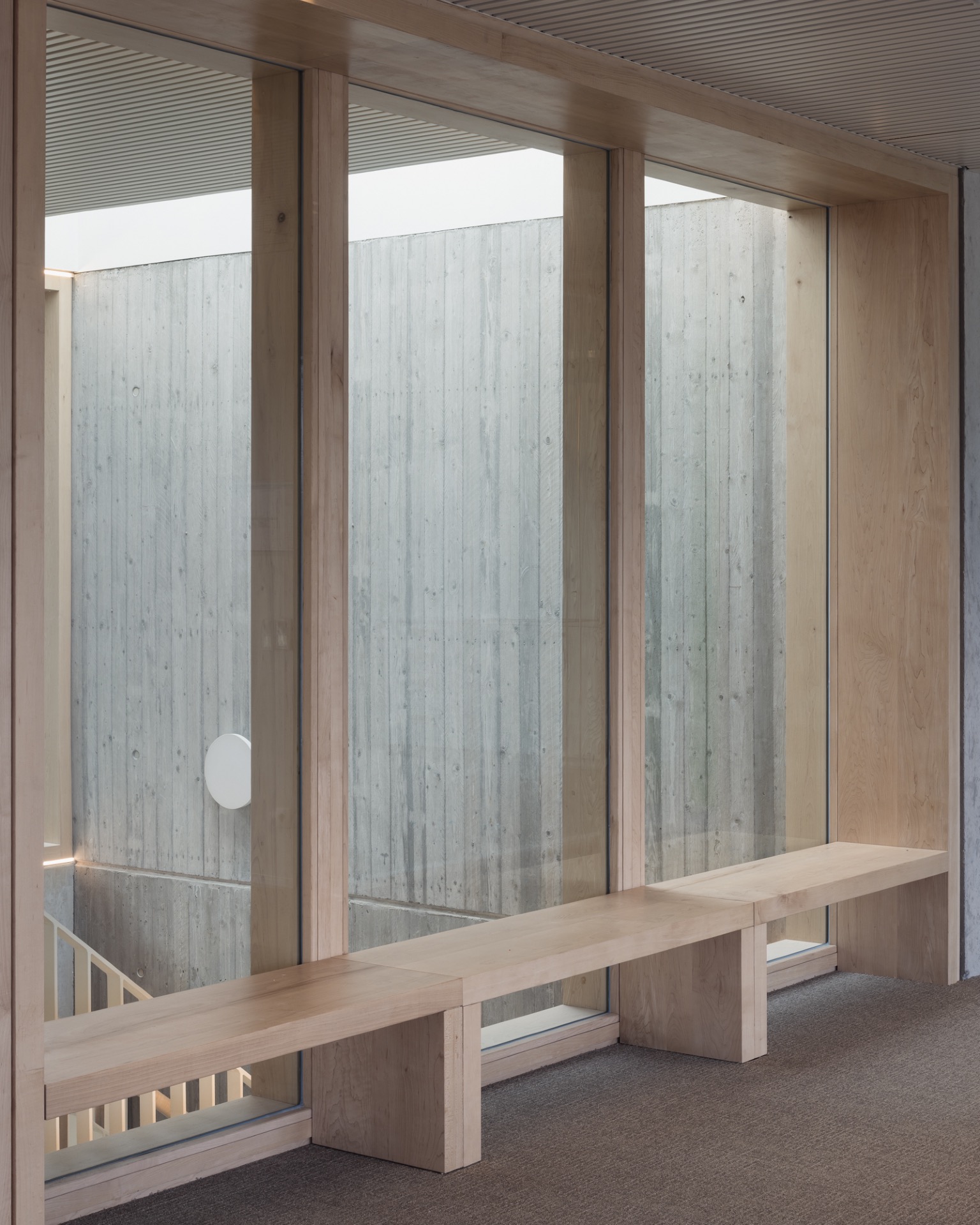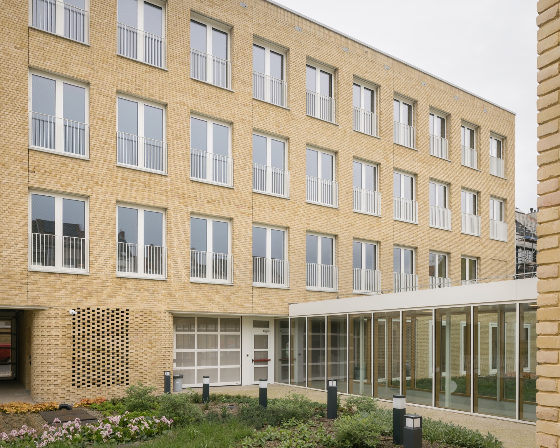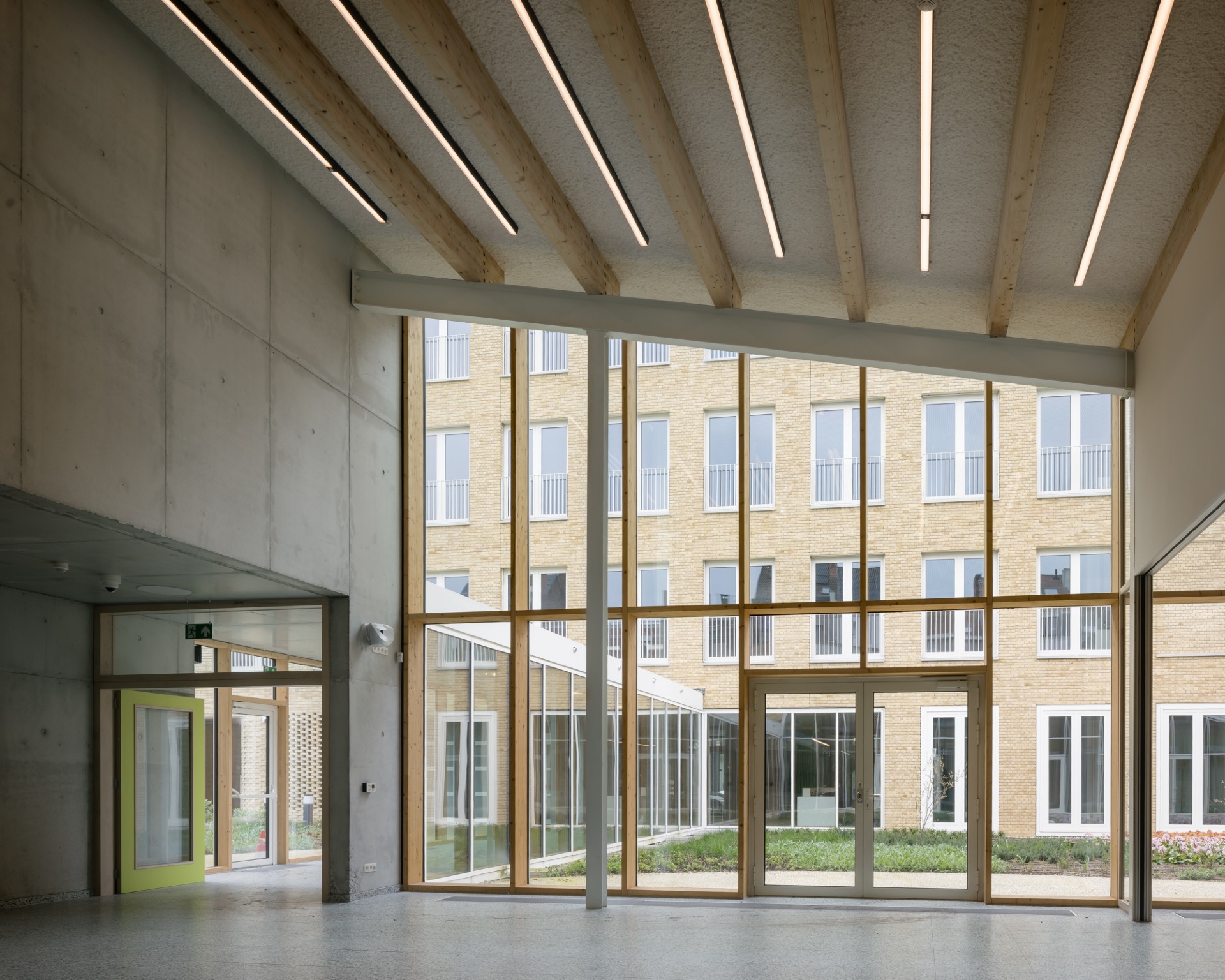 Alle toegangen voor voetgangers, fietsers en auto’s zijn samengebracht in één grote overdekte ruimte. Deze ruime toegang biedt ook zicht op het nieuwe groene binnengebied. De patio is een rustige, groene plek met een ruim terras dat aansluit op de vergaderfaciliteit. In de gevels van het gebouw zijn vogelnestkasten geïntegreerd. Voor de BREEAM-certificatie is samen met Corridor gewerkt aan het verbeteren van de ecologische footprint van de site. Corridor voerde een siteanalyse uit en formuleerde aanbevelingen voor vergroening en biodiversiteit. Uit de analyse bleek dat we ons best kunnen richten op twee vogelsoorten: de gierzwaluw en de zwarte roodstaart. Hiervoor zijn nestkasten geïntegreerd in de architectuur, specifiek als betonnen nestkasten ingemetseld in de muren.
