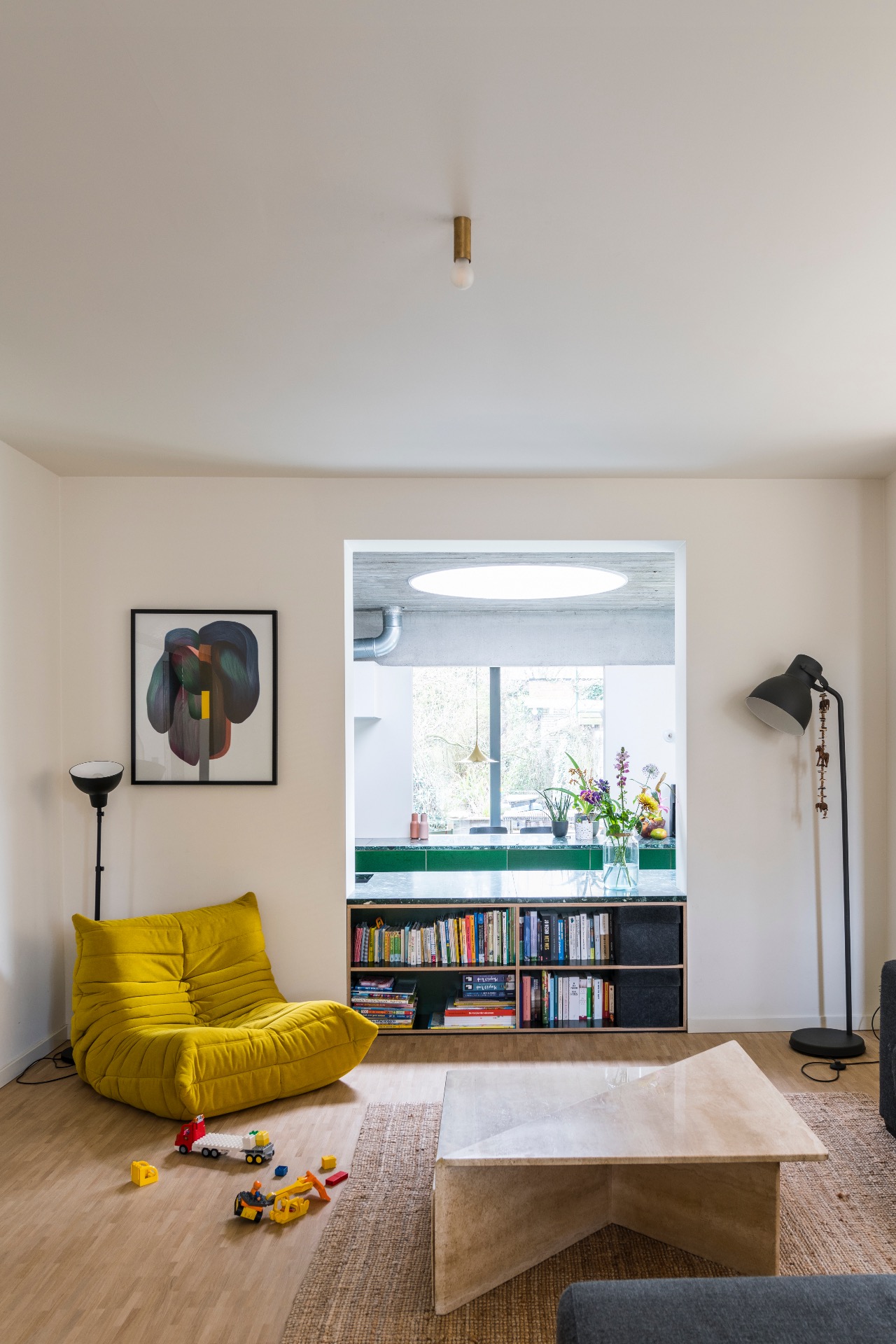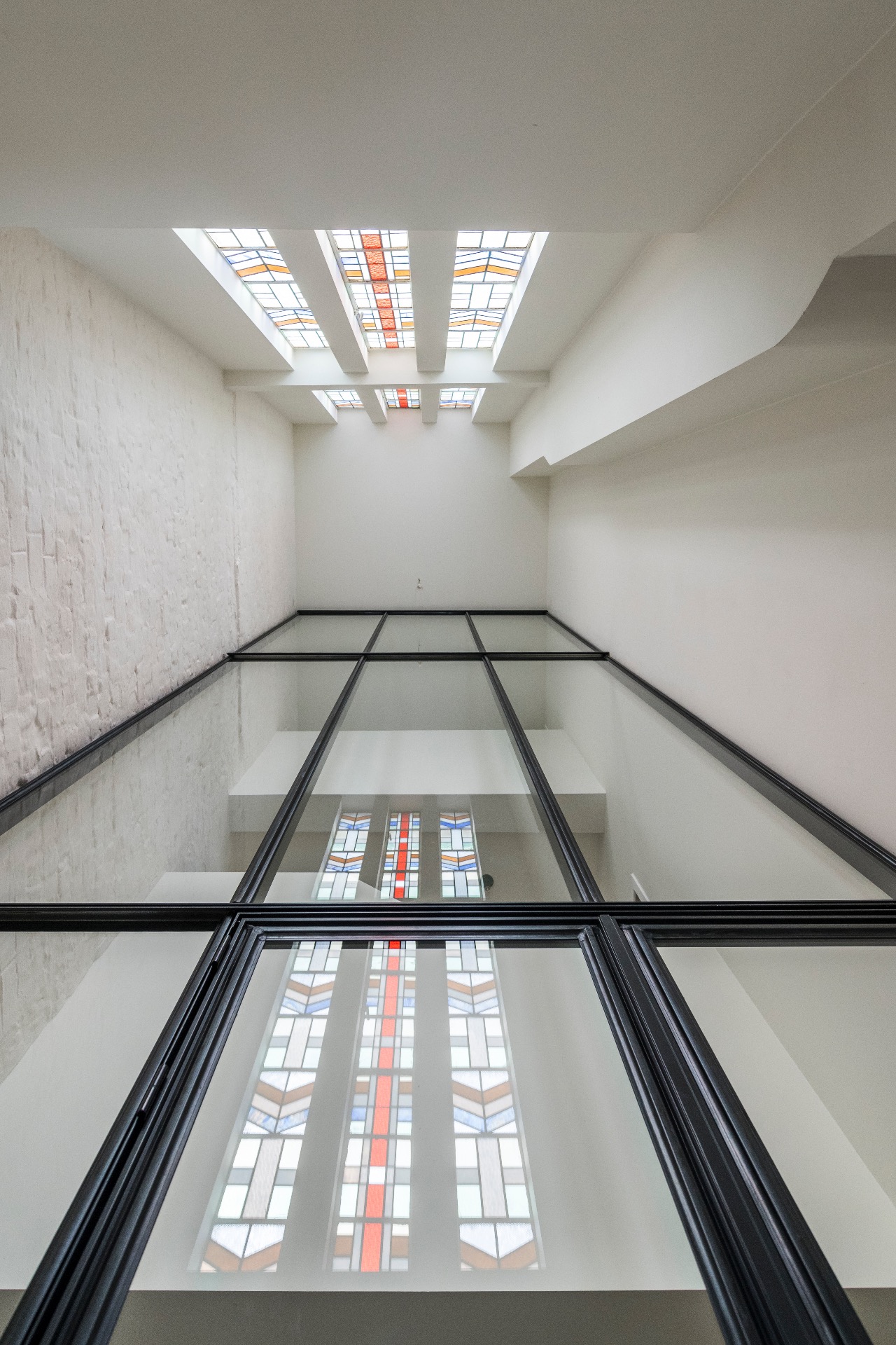 Eén van de uitdagingen bestond erin om respectvol om te gaan met het bestaande patrimonium en toch een duurzame, lichtrijke woning te realiseren. Behoud van karakter speelt hierin een cruciale rol. In de bestaande woning werden de ruimtes gestript, met als grote ingreep het openmaken van de statige traphal van het gelijkvloers tot in het dak. Door met een glazen scheidingswand te werken, komt het glas-in-loodraam in de voorgevel ook binnen extra mooi tot zijn recht. Oud en nieuw werd in elkaar verweven, elkaar versterkend in hun materialiteit en doorgedreven detaillering.