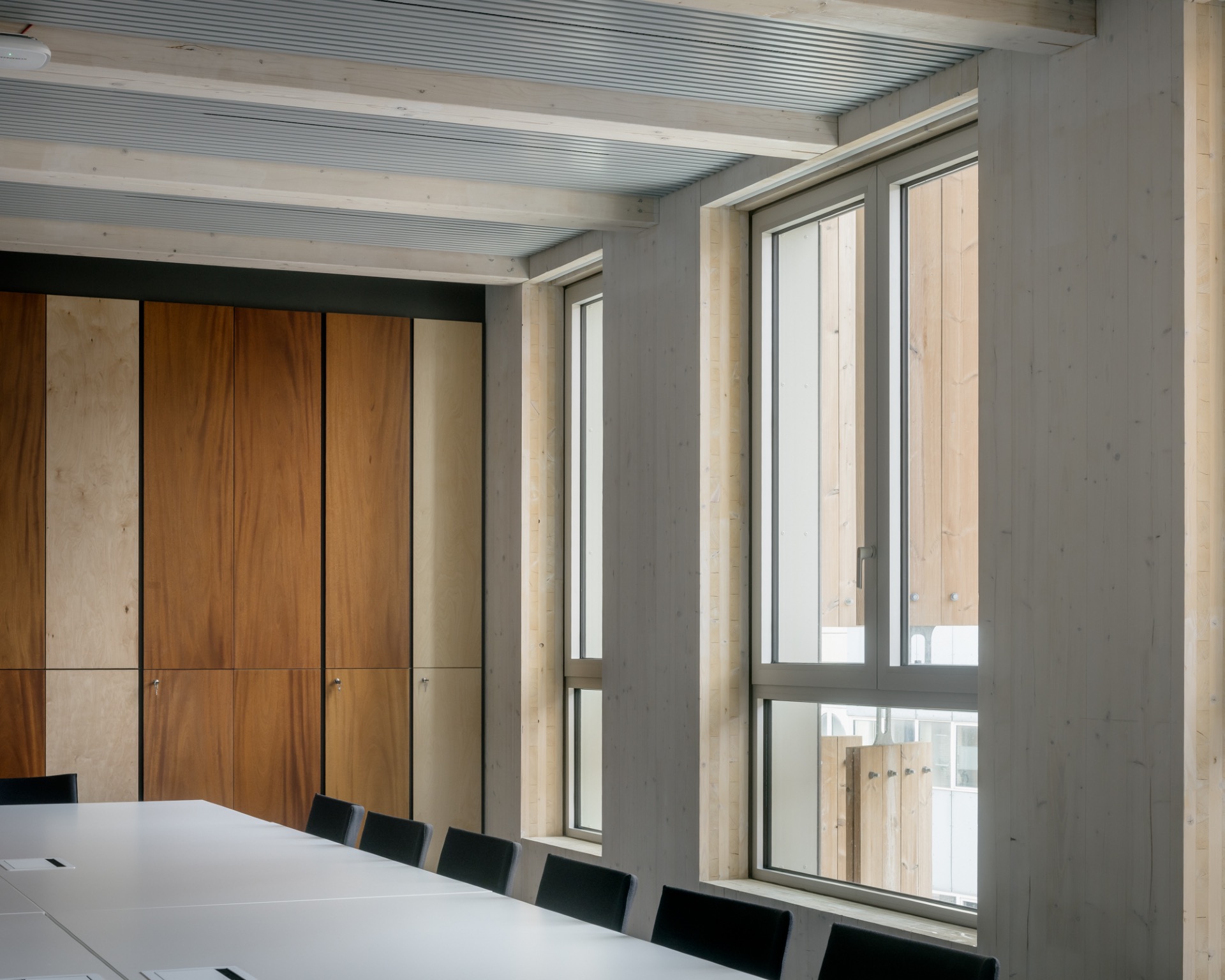 Door de achterbouwvolumes open te werken en helder te verbinden met het nieuwe volume, kon het gewenste bouwprogramma volledig worden gerealiseerd. Het gebouw aan de Koning Albertlaan werd losgekoppeld en er werden twee open, groene tuinen aangelegd in het binnengebied, die naadloos aansluiten op de cafetaria en vergaderruimtes. Tijdens de afbraakfase werd een volledige inventaris gemaakt van de bestaande losse en vaste infrastructuur, inclusief schrijnwerk en demonteerbare bouwmaterialen. Isolatie, binnenschrijnwerk en afwerkingsmaterialen kregen hierdoor een tweede leven via een alternatief circuit. Specifieke elementen werden hergebruikt in het nieuwe gebouw. Het nieuwe hoofdvolume aan de straatzijde heeft op het gelijkvloers een glazen, naar binnen knikkend volume en een brede onderdoorgang, waardoor een sterke link ontstaat tussen het binnengebied en de straat. De toegang tot het gebouw, het binnengebied en de ondergrondse fietsenstalling worden op deze manier in één beweging ontsloten.