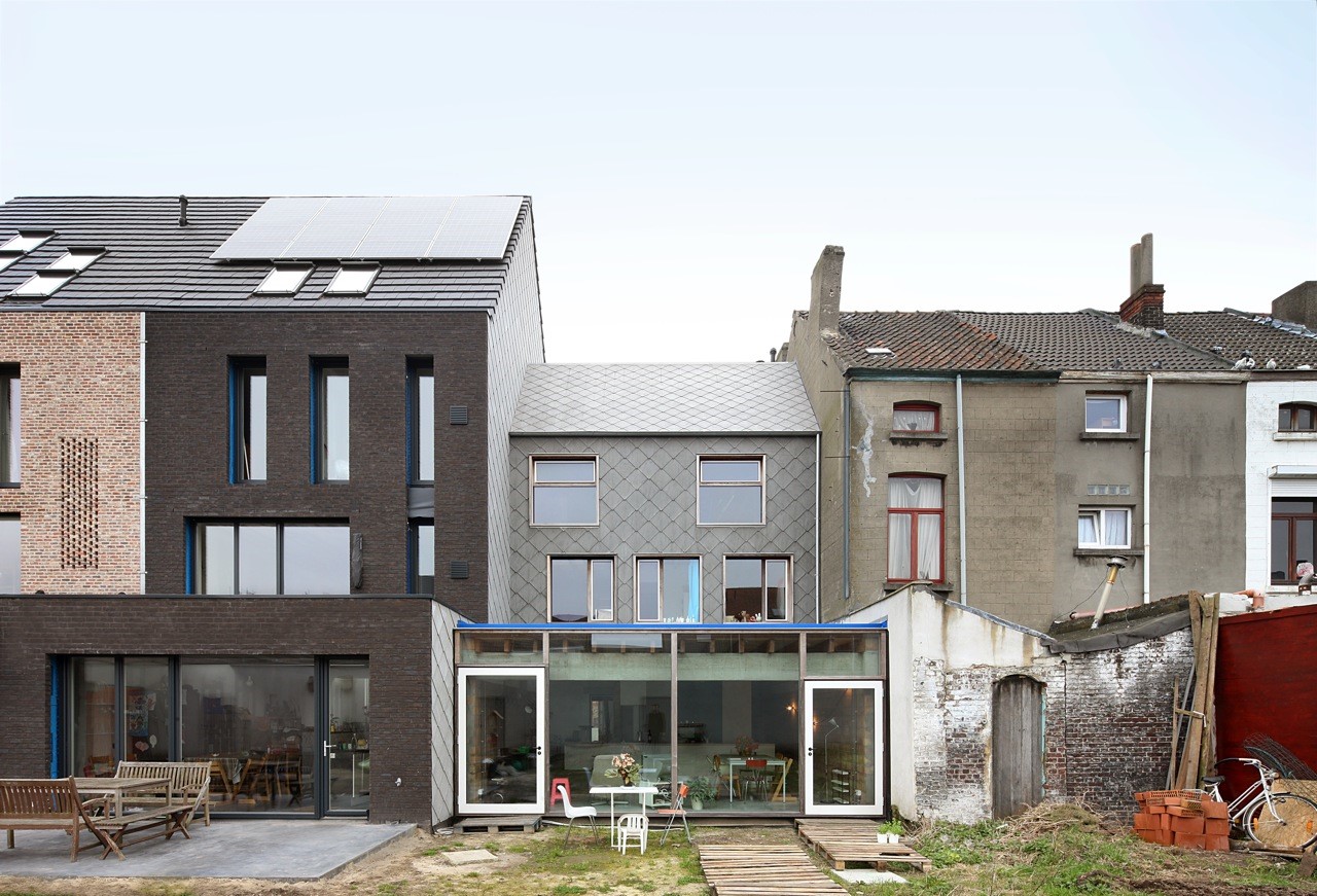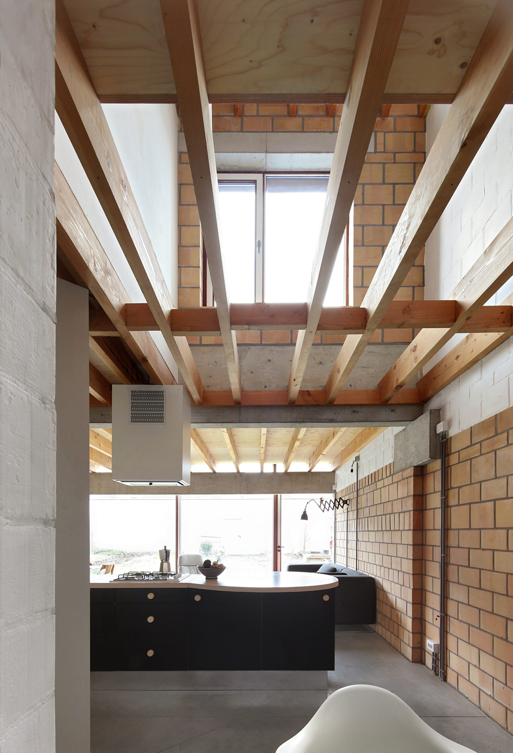 De leefruimtes zijn georiënteerd weg van de drukke straat en gericht op de tuin, wat zorgt voor rust en privacy. De zes meter brede gevel maakt een dwarsgerichte trap mogelijk, die samen met grote raampartijen zorgt voor een overvloed aan daglicht in de woning. Binnenin zijn houten balken zichtbaar die de ruimte structureren en een warme, huiselijke sfeer creëren. De gevel is opgebouwd uit onregelmatig metselwerk, waarbij de bakstenen niet worden verborgen maar juist worden benadrukt, wat bijdraagt aan het karakter van de woning.