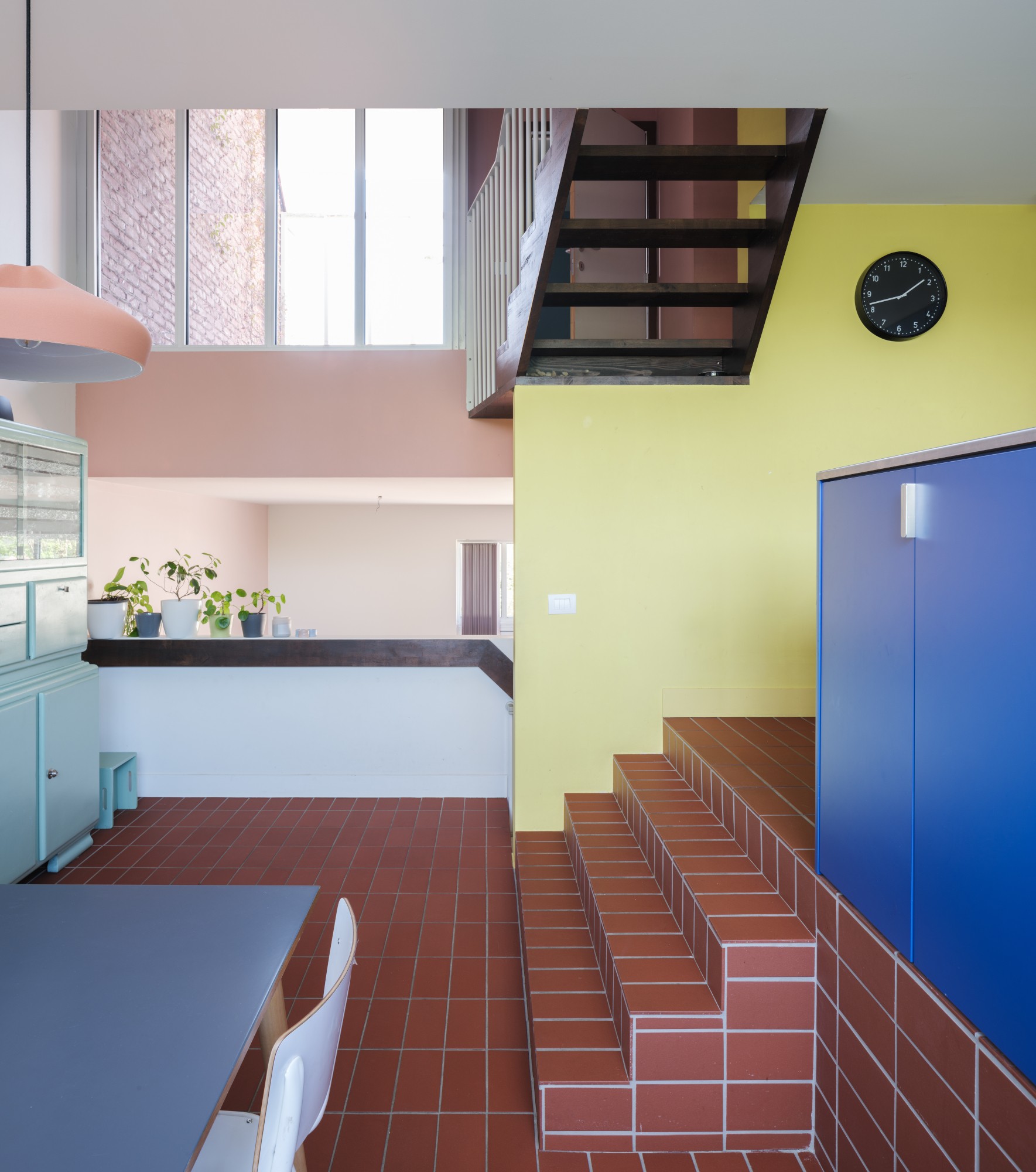 Zoals in elk van hun projecten streefde het ontwerpteam naar tijdloosheid zonder spektakel. Duurzaamheid zit hier niet in technologie, maar in evenwichtige ruimtelijkheid, genereuze lichtinval en een helder spel van zichtlijnen. De ontwerpvraag van de bewoners stond centraal: een woning met afgebakende, semi-open ruimtes per functie, zonder in klassieke kamers te vervallen. Hoogteverschillen en split-levels creëren afwisseling en verbondenheid tegelijk. Het hart van de woning is een smal, diep in het volume snijdend dakterras. Het brengt licht tot in de kern van het huis en vormt het kruispunt van alle ruimtes. De woning voelt robuust aan, met massieve vlakken die zorgvuldig gecomponeerd zijn tot een rustige, gelaagde woonstructuur.