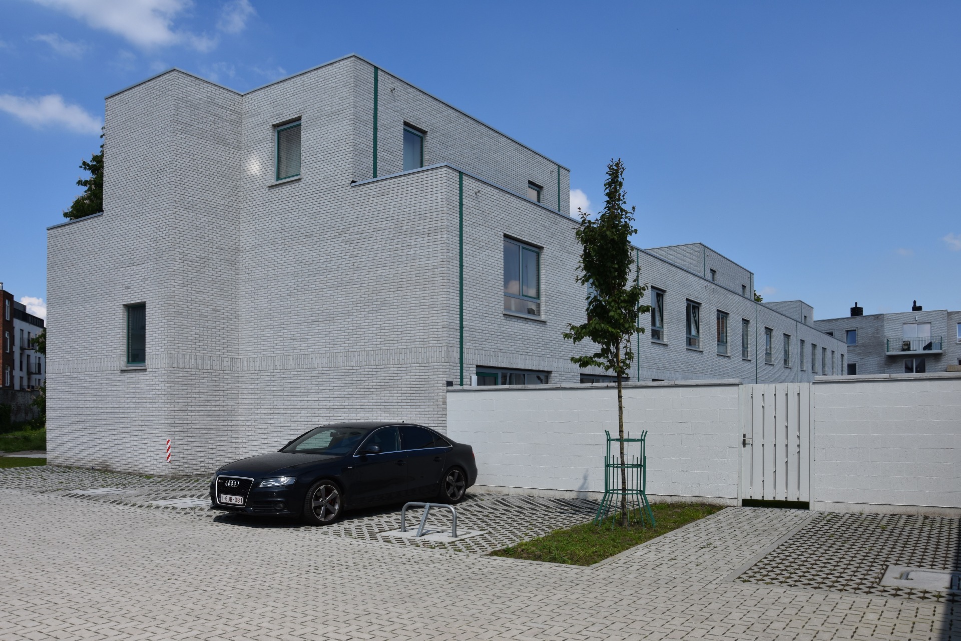 De negen rijwoningen aan het park zijn ontworpen met aandacht voor de relatie met het park. De keuken van het ene type en de eetruimte van het andere type geven uit op het park en interageren met voorbijgangers. Het park loopt tot aan de woningen. De zone tussen het fietspad en de woningen wordt beplant met lage struiken en kleine bomen voor privacy zonder de woningen te verbergen. Deze actieve gevel zorgt voor een aangename sfeer in het park. Het gebouw aan de Rooigemlaan, een appartementencomplex met acht units, volgt de typologie en schaal van de omliggende gebouwen. De bouwdiepte is aangepast aan de bestaande buren, zodat het gebouw zich optimaal inpast in de omgeving.