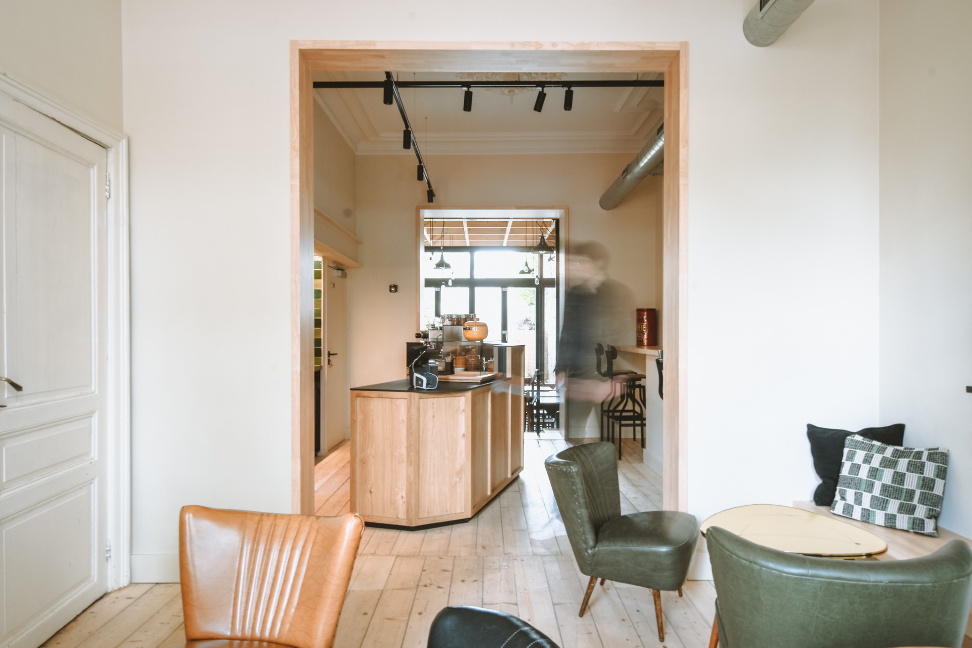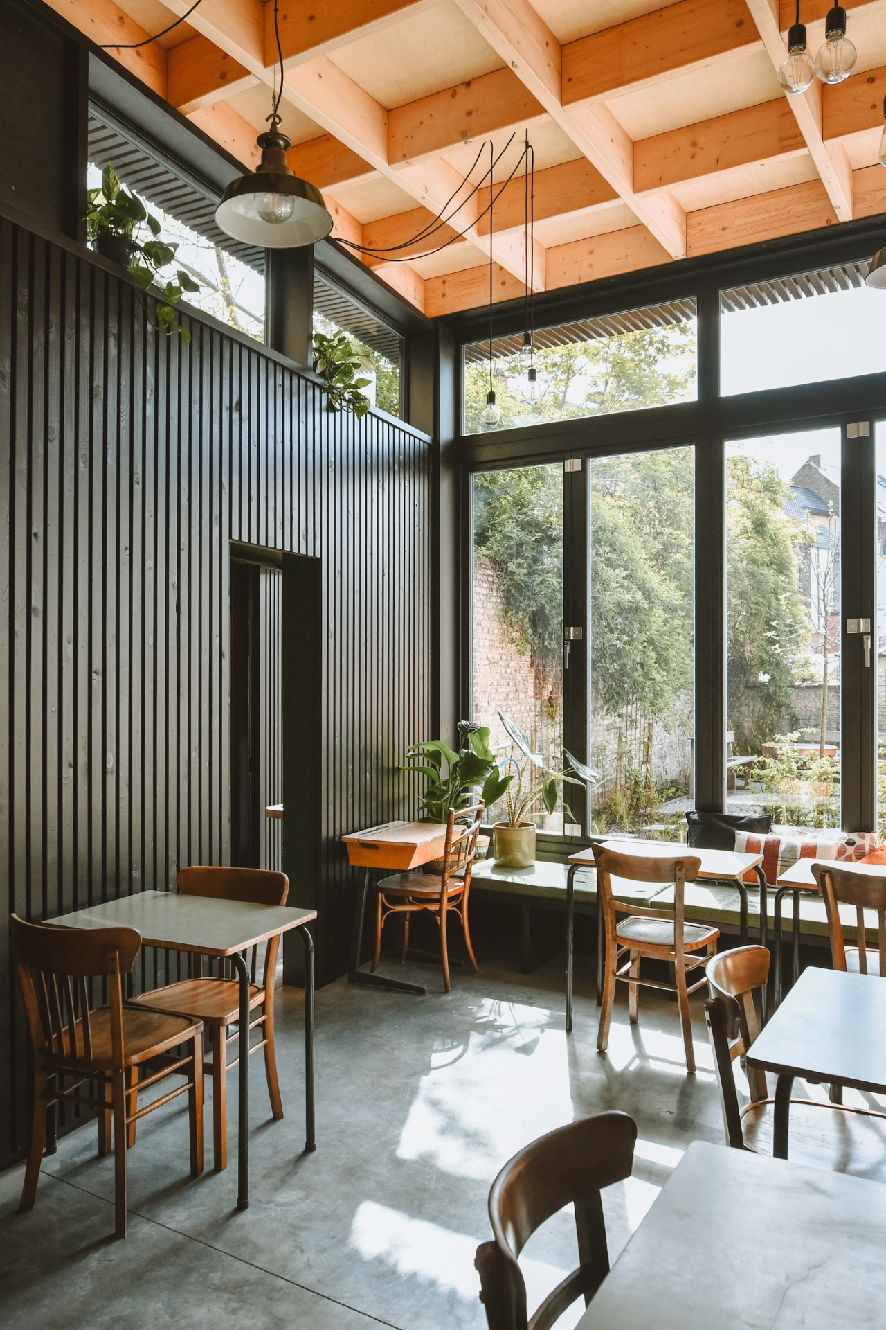 Het grote hoogteverschil tussen de rechter- en linkerbuur achteraan inspireerde een verspringing in het dakvlak. Waar de verbruiksruimte profiteert van een hogere plafondhoogte, is dit minder noodzakelijk voor het sanitair en de bijkeuken. Deze verspringing zorgt ervoor dat de ochtendzon dynamisch binnenvalt tijdens het ontbijt en de brunch. De dakvorm houdt rekening met de positie van de ramen in de bestaande achtergevel op het eerste niveau. Het interieurontwerp is nauw verweven met het architectuurontwerp. De centrale toog met de koffiemachine is de eyecatcher. De eiken panelen met omlijsting verwijzen subtiel naar het statige en oorspronkelijke interieur. In de tuinkamer wordt het speelse interieur ondersteund door de architecturale vormgeving van de kolommen en balken. Het ontwerp maakt een eenvoudige reconversie van horeca naar eengezinswoning mogelijk.