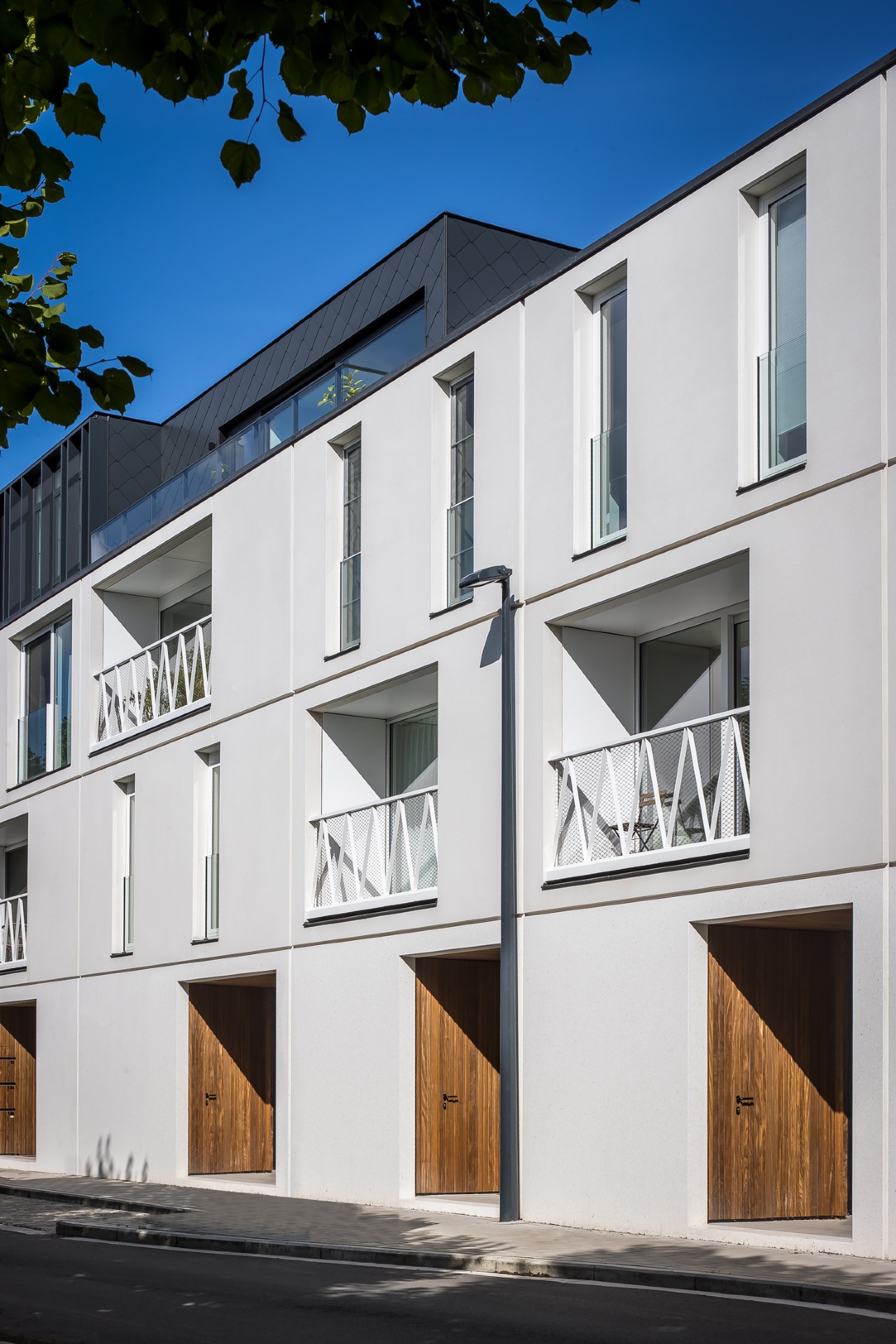 Diepe raamneggen en terrassen worden voorzien in de voorgevel in functie van de dieptewerking en een krachtige architectuur voor zowel een eenheid te creëren als zowel de individualiteit weer te geven van elke unit. De modulering van de 6 panden worden gekenmerkt door de gelijke basis en worden als volg opgebouwd, Op het gelijkvloers betreedt je de woning via houten inkomportieken die het geheel een warm karakter en de verschillende inkomzones weten te accentueren. Zowel bij de 4 ééngezinswoningen als bij de schakelwoningen bevinden zich aan de tuinzijde de leefkeuken. Op de 1ste verdieping is de zitkamer zodanig gelokaliseerd met terras (door de positionering van de trap), aan de straatzijde in functie van de levendigheid naar de straat, waarbij een centrale vide verbinding bij de eengezinswoningen biedt met de leefruimte en keuken zodanig het tot één geheel weet te transformeren.
